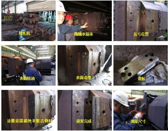 而目前索雷碳納米聚合物材料可以實現現場快速修復,該材料具備優(yōu)越的粘著力,可以牢固附著在金屬基材表面,長期工作而不會脫落;產品自身具有極高的抗壓強度,在軋制力作用下,材料也不會損壞;獨特的材料良好的抗沖擊性能,可以吸收軸承座對牌坊的沖擊,避免了磨損的產生;同時產品具有良好的耐腐蝕性能,可使牌坊表面免受冷卻水的侵蝕。