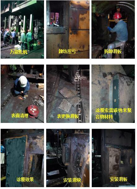 一般針對軋機(jī)牌坊滑塊位壓虧的問題,企業(yè)通常采用添加金屬墊片來解決此類問題,由于壓虧部位尺寸不均勻,導(dǎo)致其修復(fù)效果不理想。激光熔覆技術(shù)修復(fù)成本過高,工期長等原因無法在短時間內(nèi)完成修復(fù),F(xiàn)場修復(fù)是近幾年興起的一種檢修模式,其原理是在不機(jī)加工的前提下,采用索雷碳納米聚合物材料修復(fù)技術(shù)在現(xiàn)場進(jìn)行修復(fù)。修復(fù)用的材料固化后形成的化學(xué)鍵連接作用力使其與修復(fù)的金屬部件形成優(yōu)異的粘著力,滿足設(shè)備在運行中承受各種復(fù)合力的要求。此類修復(fù)材料性能較為可靠。