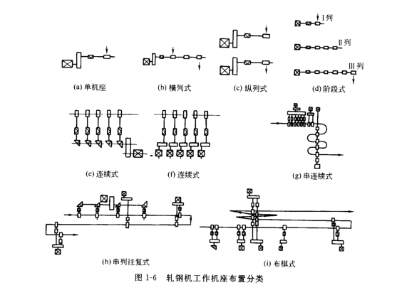 軋制比較復雜的斷面(角鋼,槽鋼等),因此連軋機調(diào)整復雜,通常采用半連續(xù)式(見圖1-6g),它是由兩個機座組成,其中一組布置成連續(xù)式(粗軋機組),另一組布置成橫列式精軋機組或階段式。
