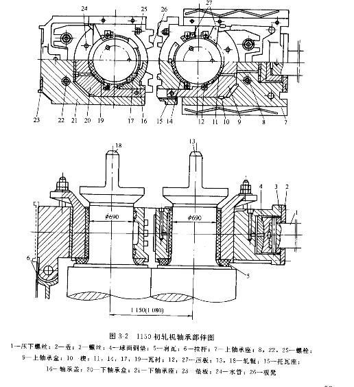1150初軋機軋輥部件的結(jié)構(gòu)圖及立體示意圖如圖 3-2 及圖3-3所示。上軋輥放置在上軸承盒9及托瓦座 15 之間。瓦襯都是夾布膠木瓦,上軸承盒中有徑向瓦襯11 及肩瓦5,托瓦座中同樣也有徑向瓦襯14 及肩瓦。徑向瓦襯是用壓板 12定位。上軸承盒的腿插入托瓦座,并用螺栓 25緊固連接。初軋機與型鋼軋機不同點在于;在上軸承盒及機架間尚有一個上軸承座 7,上軸承座通過球面銅墊 4 與壓下螺絲1相接觸。軋制時,軋制壓力通過上軸承盒、上軸承座、球墊、壓下螺絲較終傳遞給機架上橫梁。在上軸承盒的上部有兩個突耳,突耳通過固定在上軸承座的螺栓 8使軋輥進(jìn)行軸向調(diào)整。這種軸向調(diào)整的形式對于上軋輥移動量極大且次數(shù)頻繁的初軋機是較理想的,這也是軋輥部件中多設(shè)置一個上軸承座的原因所在。上軸承座法蘭內(nèi)側(cè)鑲有耐磨滑板 28。