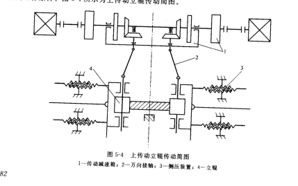 上傳動(dòng)的立輥是指主傳動(dòng)裝置放在上面,用萬向接軸傳動(dòng)立輥。采用上傳動(dòng)可改善傳動(dòng)裝置的工作條件。圖5-4所示為上傳動(dòng)立輥傳動(dòng)簡圖。