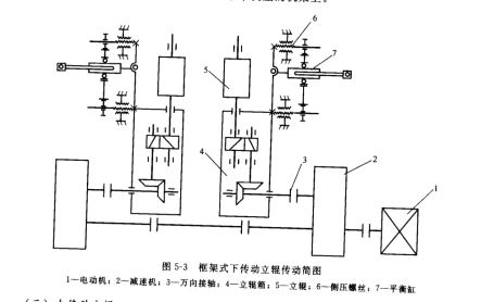 圖 5-3所示為框架式下傳動(dòng)立輥傳動(dòng)簡圖。它是由一臺(tái)電動(dòng)機(jī)1,通過主傳動(dòng)減速機(jī) 2、萬向接軸 3、立輥箱 4來傳動(dòng)立輥5,為保證、右壓下螺絲的同步,減速機(jī) 2 之間用一根軸連接起來。為便于維護(hù)檢修,電動(dòng)機(jī)放在軋機(jī)組的主傳動(dòng)側(cè)。立輥機(jī)座的主傳動(dòng)裝置安裝在地基上,側(cè)壓螺絲6和立輥箱 4安裝在水平機(jī)座的機(jī)架上。