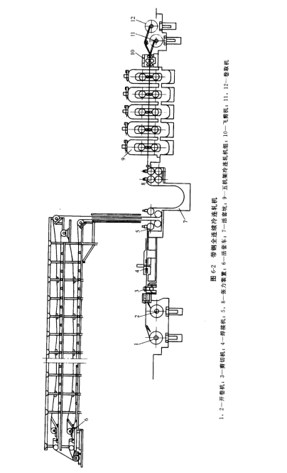 自 1979年開始,出現(xiàn)了全連續(xù)冷連軋機(jī),如圖6-2 所示。這種軋機(jī)只要****次引料穿帶后,就可實(shí)現(xiàn)連續(xù)軋制。 后續(xù)帶卷的頭部通過焊接機(jī)與前一帶卷尾部焊接在一起,軋成后用飛剪機(jī)分卷。并由兩臺(tái)卷取機(jī)交替卷取帶鋼。 全連續(xù)冷連軋,機(jī)即使在換輥時(shí)。帶鋼依然停留在軋機(jī)內(nèi),換輥后可立即進(jìn)行軋制。采用全連續(xù)冷連軋機(jī),可以提高生產(chǎn)率 30%~50%,產(chǎn)品質(zhì)量和收得率也都得到提高。