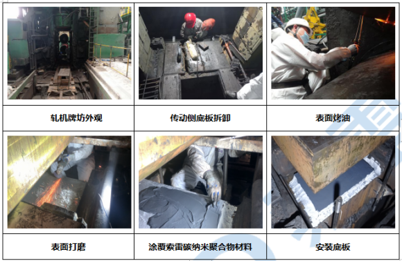 3.涂抹索雷碳納米聚合物材料,安裝底板,并調(diào)整底板的安裝精度,如高度、水平度等。固定底板保持材料固化。再次緊固底板,修復(fù)完成。