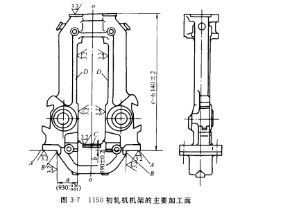 機(jī)架是軋鋼機(jī)主要零部件,為了保證正常軋制,為了保證必要的軋制精度及安裝調(diào)整的方便,對(duì)機(jī)架的機(jī)械加工有嚴(yán)格的要求。下面以1150初軋機(jī)機(jī)架為例,簡(jiǎn)單地介紹機(jī)架加工方面的技術(shù)要求(見(jiàn)圖3-7)