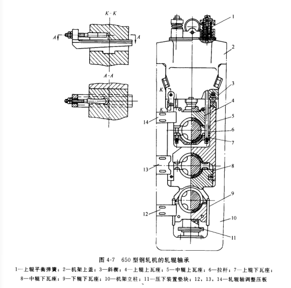 650型鋼軋機(jī)的軋輥軸承如圖4-7所示,五塊整體壓制徑向和軸向膠木瓦分為別裝在相應(yīng)的五個(gè)瓦座中,除中輥上瓦座5的材料為ZG40Cr外,其余瓦座為ZG35,上輥上瓦座4通過(guò)墊塊與壓下螺絲端部接觸,下壓座7通過(guò)拉桿6(每邊一根)掛在平衡彈簧上。為便于換輥,中輥上瓦座5是“H”形瓦座(簡(jiǎn)稱H架),他向下的兩條腿通過(guò)嵌于機(jī)架上蓋燕尾槽中的斜楔3支撐在機(jī)架上,當(dāng)中輥襯瓦磨損時(shí),可通過(guò)斜楔3進(jìn)行調(diào)整,使“H”形瓦架始終壓在中輥輥頸上中輥的下瓦座8直接支靠在機(jī)架立柱的凸肩上,下輥只有下瓦座9,它通過(guò)墊塊11直接支在壓下螺絲上。