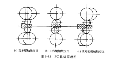 PC軋機(jī)基本上是一種四輥軋機(jī),與一般四輥軋機(jī)主要不同之處是將平行布置的軋輥改變交叉布置。在軋制過(guò)程中,當(dāng)離開(kāi)中心的距離增大時(shí),gun風(fēng)也增大,一次來(lái)控制凸度,這與使工作輥凸度變化等效。就是說(shuō),PC軋機(jī)是利用調(diào)節(jié)軋輥軸線的交叉角度來(lái)控制凸度,是輥縫可調(diào),而工作輥又不至于產(chǎn)生撓度。因此,凸度控制不會(huì)永祥工作輥的強(qiáng)度和剛度。軋輥軸線交叉布置可以有三種形式(見(jiàn)圖6-33):支撐輥軸線交叉布置:工作輥軸線交叉布置和承兌軋輥軸線交叉布置等。只要改變交叉角,就能改變軋輥凸度。工作輥軸線交叉布置時(shí),軋輥凸度變化范圍較大,但是這種布置形式的軋機(jī)未能的到實(shí)際應(yīng)用。因?yàn)檫@種形式布置的軋機(jī),在公祖哦gun和支撐輥之間產(chǎn)生較大的相對(duì)滑動(dòng),使軋輥磨損和能量消耗大為增加。當(dāng)支撐輥軸線交叉布置時(shí),其效果同工作輥軸線交叉布置時(shí)一樣,在工作輥和支撐輥之間同樣產(chǎn)生相對(duì)滑動(dòng),使軋輥磨損和能量消耗大為增加。當(dāng)軋輥軸線承兌交叉布置時(shí),工作輥和支撐輥之間就不會(huì)產(chǎn)生相對(duì)滑動(dòng),這就消除了上述弊端,因此得到實(shí)際應(yīng)用的PC軋機(jī)即時(shí)采用“承兌交叉”布置的軋機(jī)。