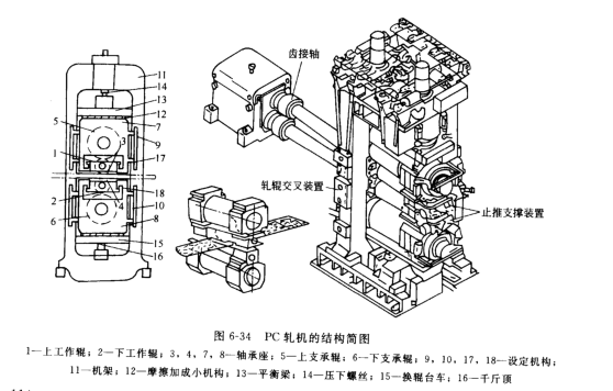 圖6-34所示為軋輥成對(duì)交叉布置的 PC軋機(jī)結(jié)構(gòu)簡(jiǎn)圖,上、下工作輾(1、2)的軸承座(3、4)分別裝在上 、下支承輥(5、6)的軸承座(7、8)中,上工作輾輸編與上支承輥軸線大致保持平行。上、下支承輥軸承座的位置設(shè)定機(jī)構(gòu)(9、10)固定在機(jī)架(11)的兩側(cè)。上、下支承輥軸承座還能借助于驅(qū)動(dòng)機(jī)構(gòu)沿軋制方向移動(dòng),或保持在所定的位置上。上支承輥軸承座通過(guò)摩擦力減小機(jī)構(gòu) (12) 由平衡梁(13)來(lái)支承,而平衡梁通過(guò)壓下螺絲(14) 把軋制力傳給機(jī)架。 下面一對(duì)軋輥承受的軋制力通過(guò)摩擦力減小機(jī)構(gòu)傳給換輥臺(tái)車(15),較后通過(guò)液壓千斤頂(16)傳給機(jī)架。上、下工作輾軸承座的位置設(shè)定機(jī)構(gòu)(17、18)也可借助于驅(qū)動(dòng)機(jī)構(gòu)使上、下工作輥軸承座沿軋制方向移動(dòng),或固定在所定位置上。