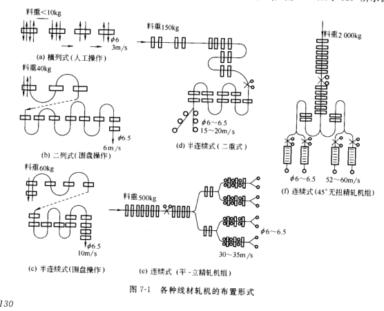 20世紀(jì) 50年代發(fā)展了半連續(xù)式線材軋機。粗軋機組布置成連續(xù)式,精軋機組布置成橫列式,中軋機組布置成連續(xù)式或橫列式。在機械化程度較高的半連續(xù)線材車間中,可以不用人工喂鋼,成品較高軋制速度可達(dá)16m/s,單重達(dá)到 200kg,年產(chǎn)量可達(dá)到 20 萬~35萬噸。半連續(xù)式線材軋機的布置形式如圖7-1(c)、(d)所示。